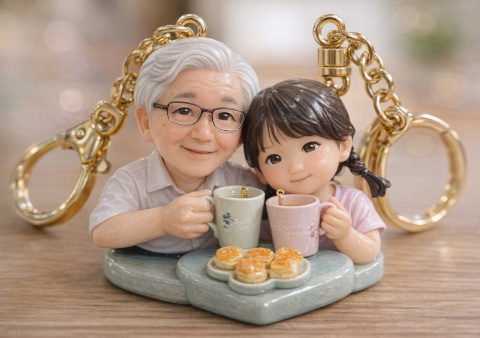2年くらい前だったと思います。今は小学校2年生になった孫娘の美桜(みお)は家族で旅行に行った時にお土産にコーヒーカップを2個買ってきました。じいちゃんとばあちゃんのためのペアカップではなく、じいちゃんとみおとのペアカップでした。早速ママが二人の写真を撮ってくれました。じいちゃんとみおはそのペアカップでコーヒーとジュースを楽しんでいます。最近、その写真をママがAIか何かで置物のような写真に加工してくれました。孫ってほんとにかわいいですね!